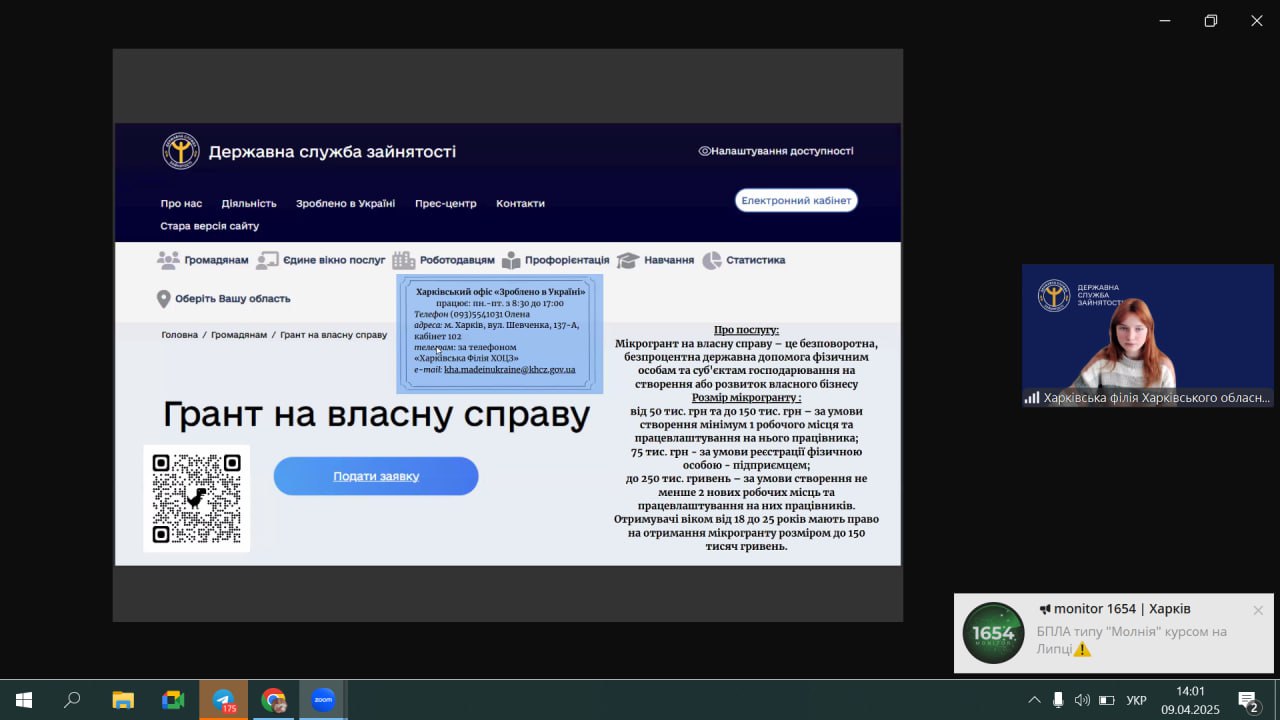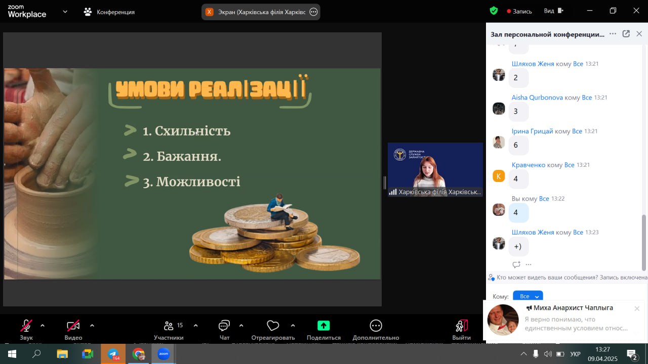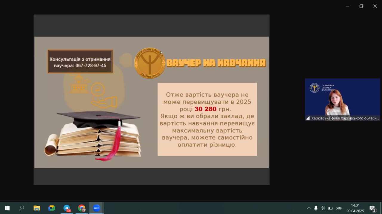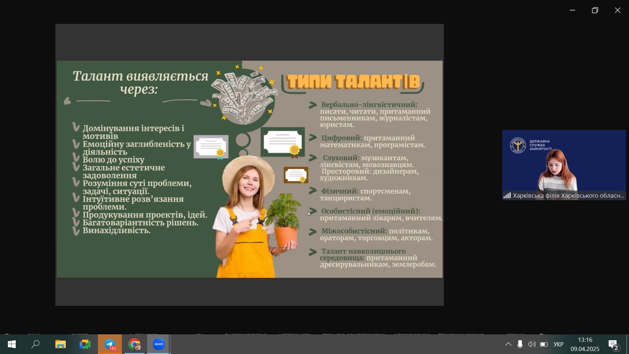 9 квітня відбулася зустріч студентів нашого коледжу з представниками Харківського обласного центру зайнятості (ХОЦЗ) на платформі ZOOM . Тема заходу ” Монетизація талантів”. Завдяки цій зустрічі здобувачі освіти дізнались як свої здібності , вміння , хобі та таланти перетворити у джерело доходів або прибутковий бізнес. Дізнались через що виявляється талант . Ознайомились зі структурою платформи профорієнтації та розвитку кар’єри Державної служби зайнятості , а також як отримати гранд на власну справу та ваучер на навчання.
