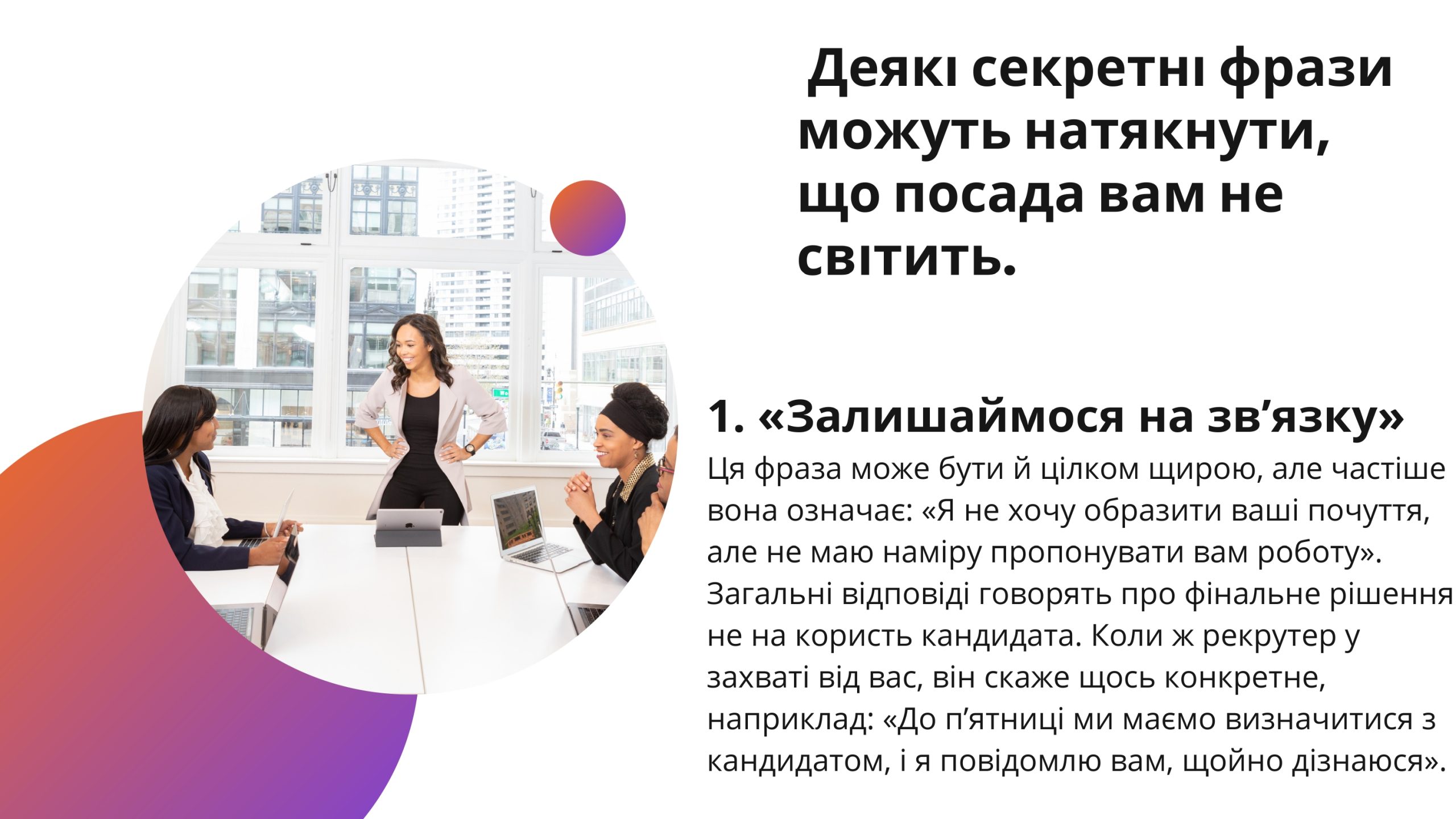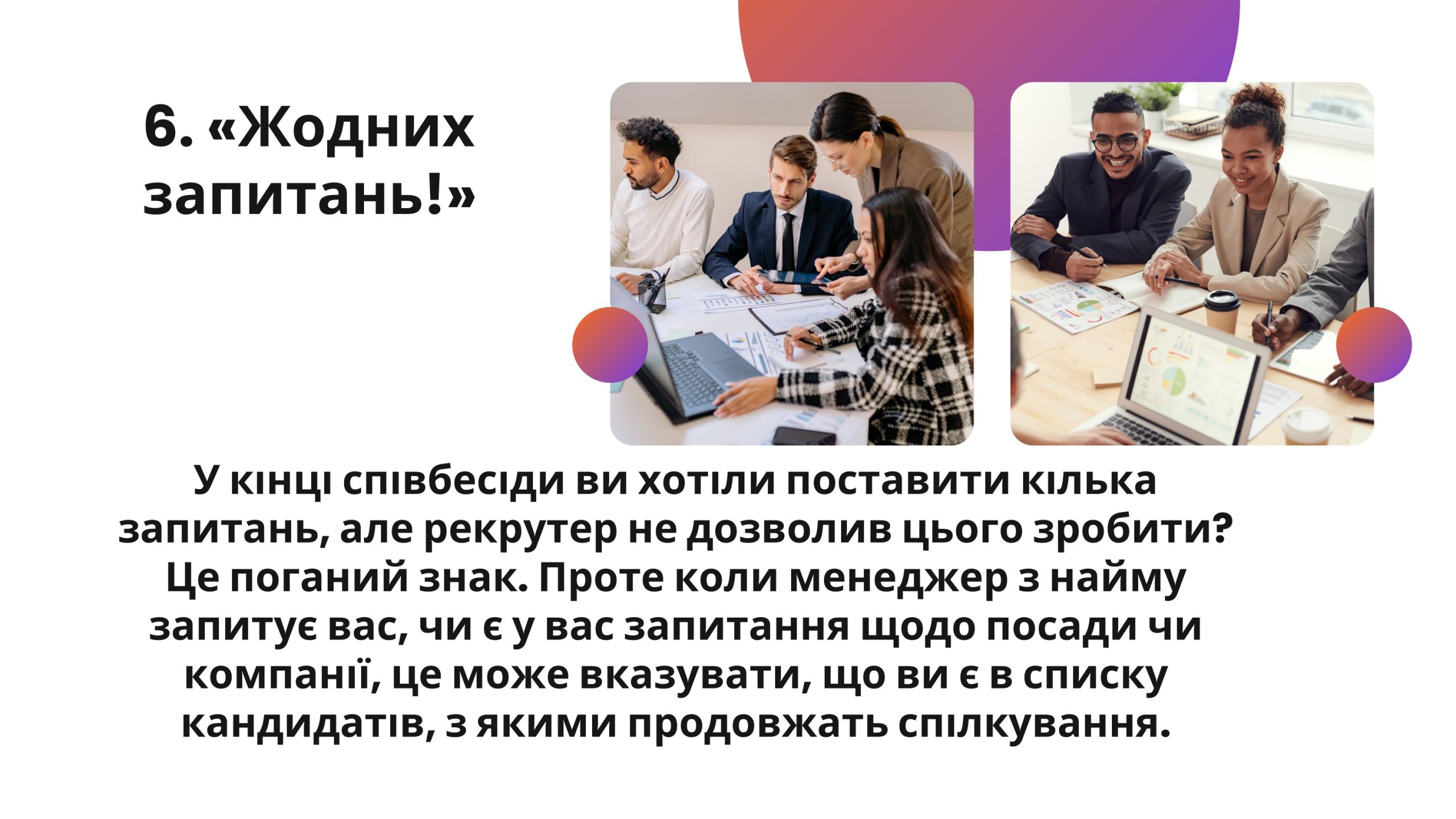 5) Забагато обіцянок й лестощів. Зазвичай це роблять власники бізнесу. На співбесіді обіцяють золоті гори, а потім не виконують нічого. Тому не втрачайте голову й перевіряйте всю інформацію.