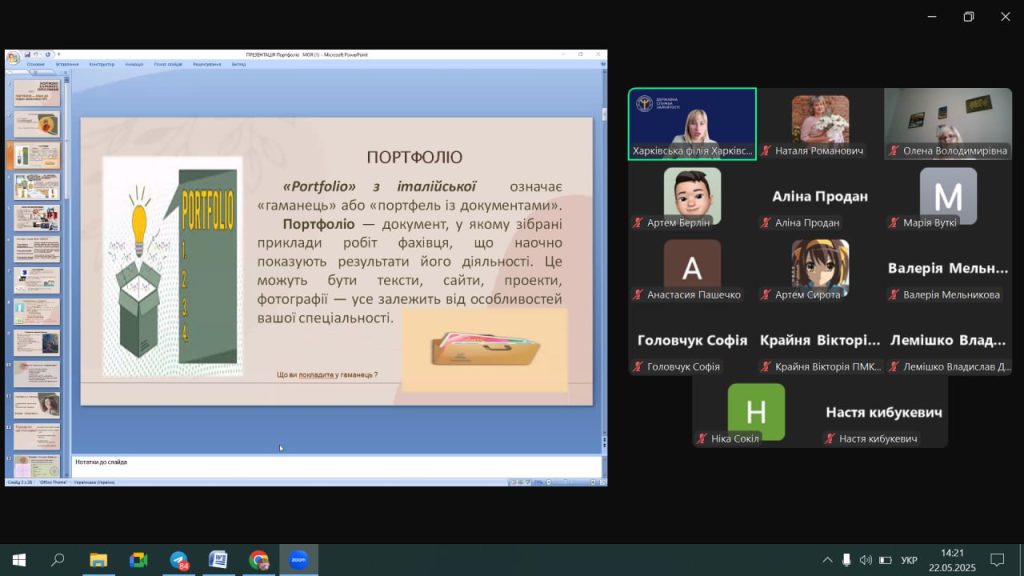 22 травня відбувся онлайн-тренінг на тему “Портфоліо кар’єрного просування”. Спікерами заходу виступили представники Харківського обласного центру зайнятості та центру кар’єри Харківського фахового коледжу технологій та дизайну.