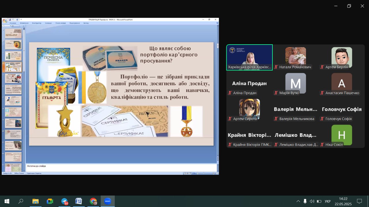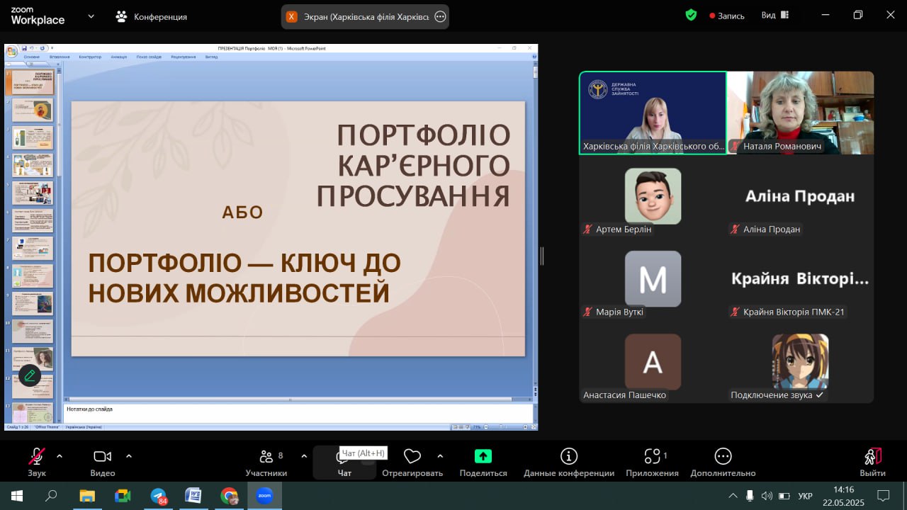 22 травня відбувся онлайн-тренінг на тему “Портфоліо кар’єрного просування”. Спікерами заходу виступили представники Харківського обласного центру зайнятості та центру кар’єри Харківського фахового коледжу технологій та дизайну.
