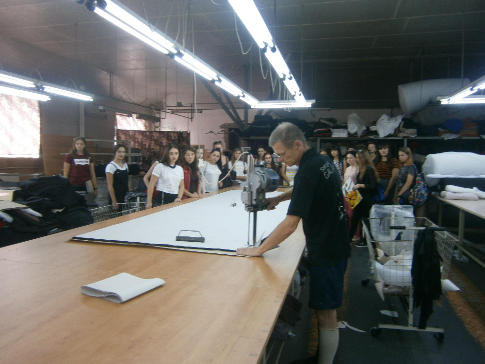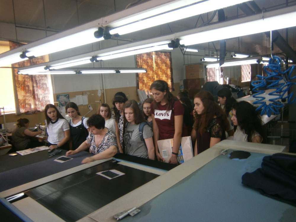 Дівчата побували в кабінеті модельєра, ще більше дізналися про свою майбутню професію, відвідали різні цехи: розкрійний, швейний, вишивальний. Познайомилися з різним спеціальним обладнанням: машинами для виготовлення петель, встановлення кнопок, вишивальними автоматами, обладнанням для проведення волого-теплової обробки виробу, пресом для з’єднання матеріалу з клейовою тканино. На підприємстві ми зустріли кілька випускників коледжу, тож відчували себе як удома.