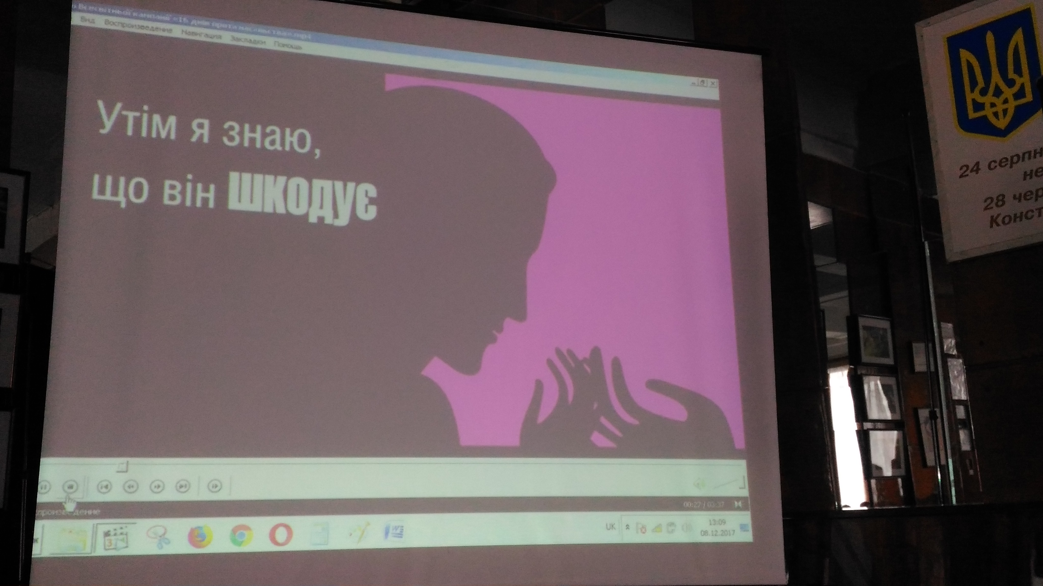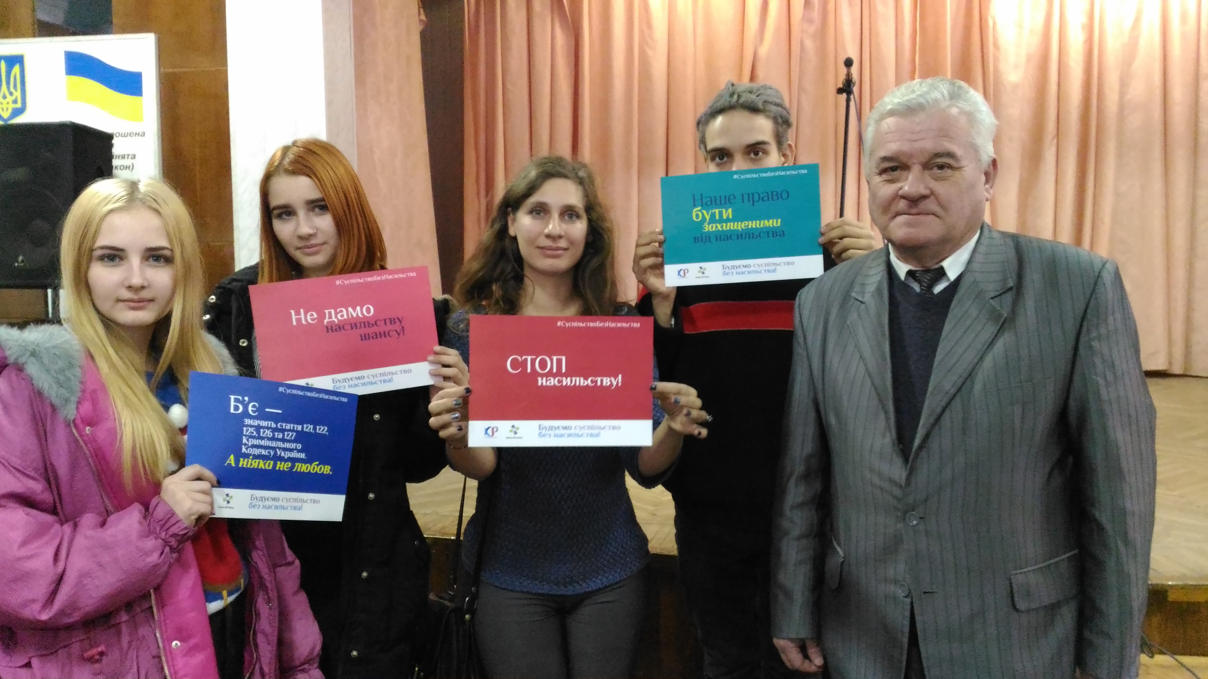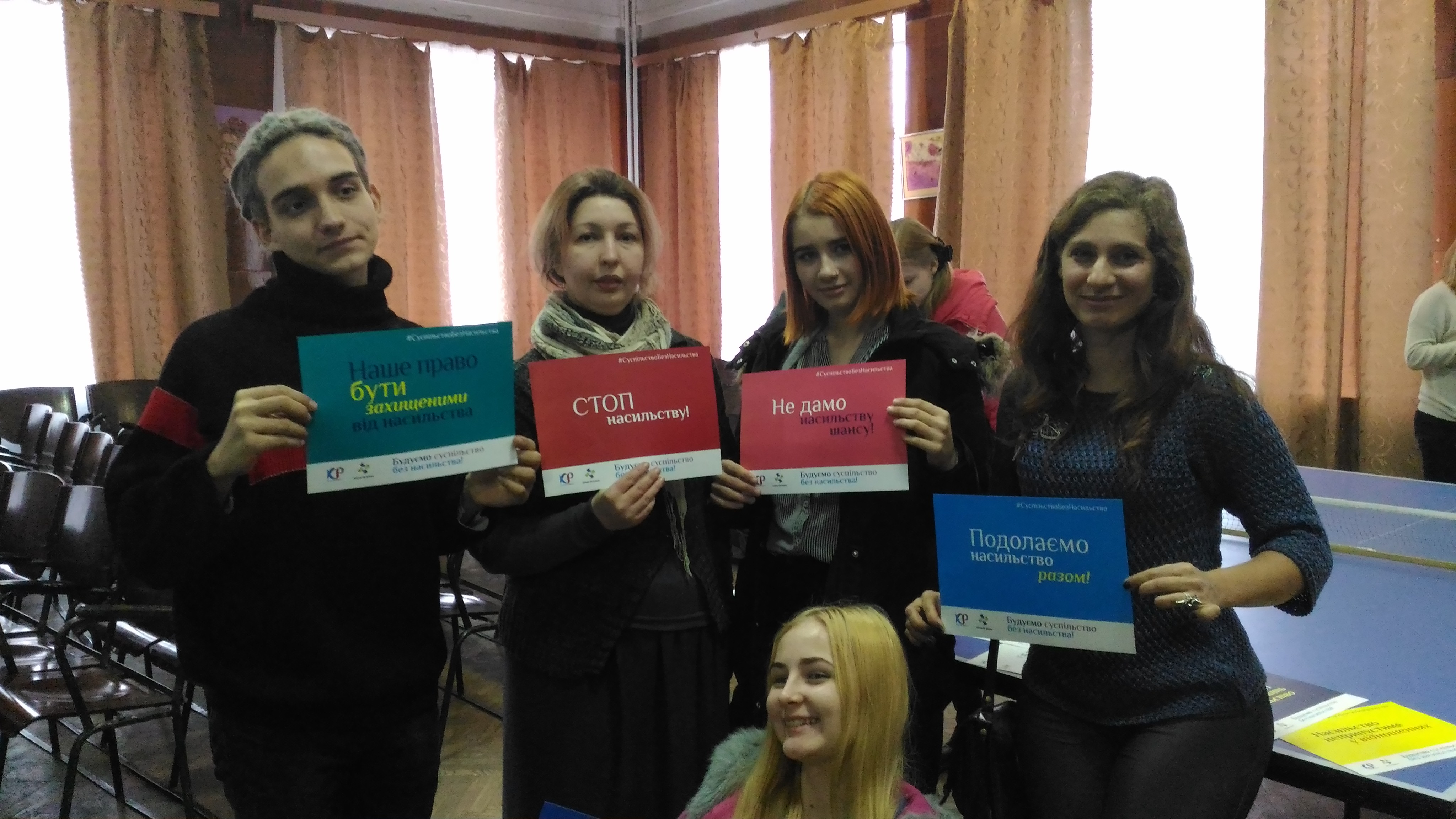 Новини Центру гендерної освіти ДВНЗ «ХКТД». 8 грудня до коледжу приїхала співробітниця Гендерного культурного центру Юлія Башук. У рамках тижня права та 16 днів боротьби з гендернообумовленим насильством у світі вона провела інтерактивну лекцію «Боротьба з насильством у правовому полі». Студенти та студентки коледжу взяли участь у флешмобі «Я проти насильства» та сфотографувалися з постерами.