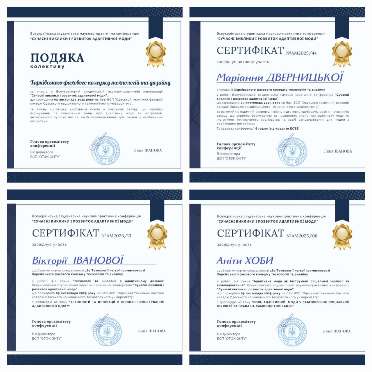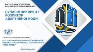Здобувачі освіти освітньо-професійної програми «Моделювання та конструювання промислових виробів» Аніта Хоба та Вікторія Іванова, під керівництвом викладача спецдисциплін Дверницької М.І., взяли активну участь у Всеукраїнській студентській науково-практичній конференції «Сучасні виклики і розвиток адаптивної моди», яка відбулася 05.11.2025р. на базі ВСП «Одеський технічний фаховий коледж ОНТУ».