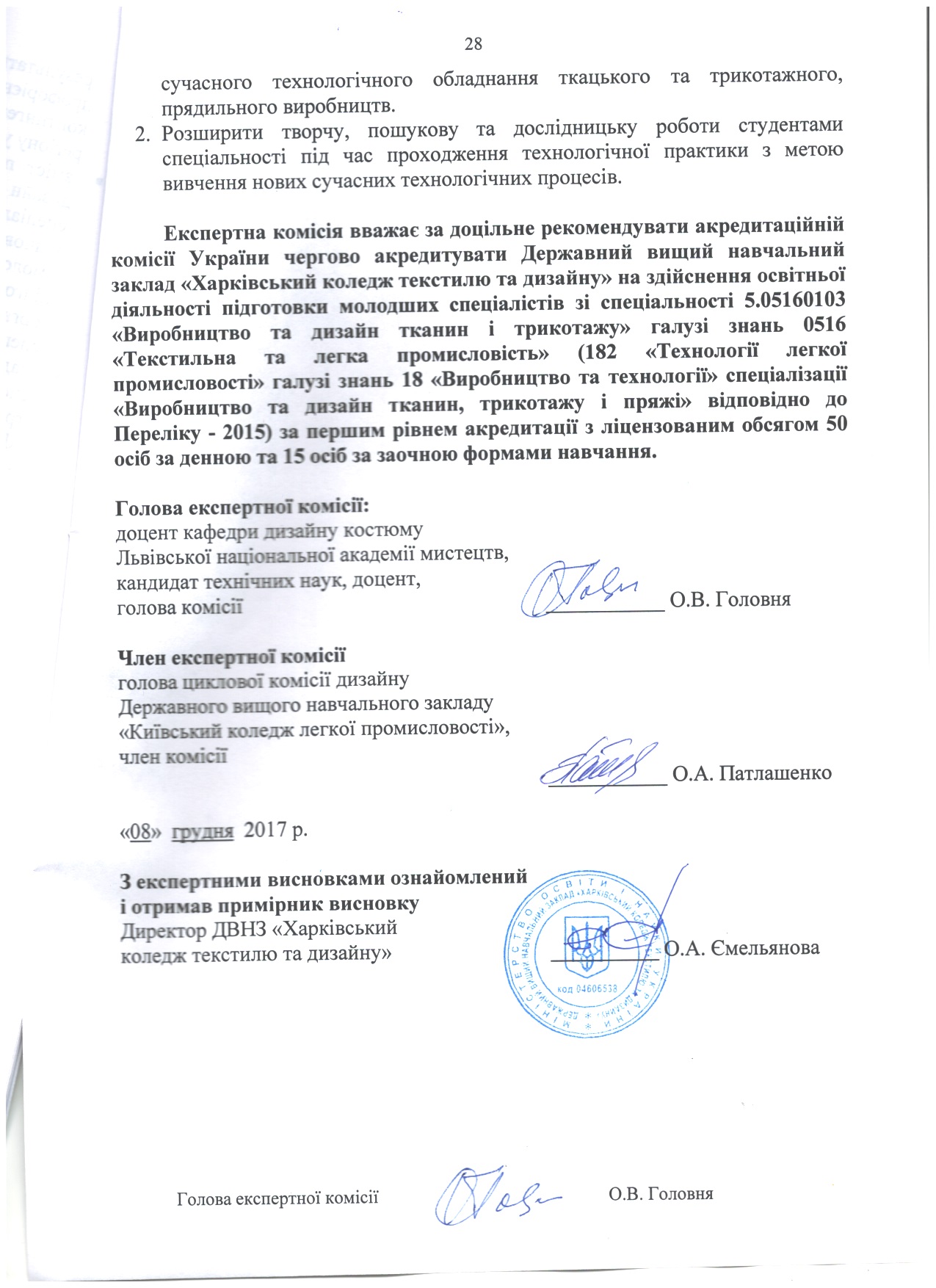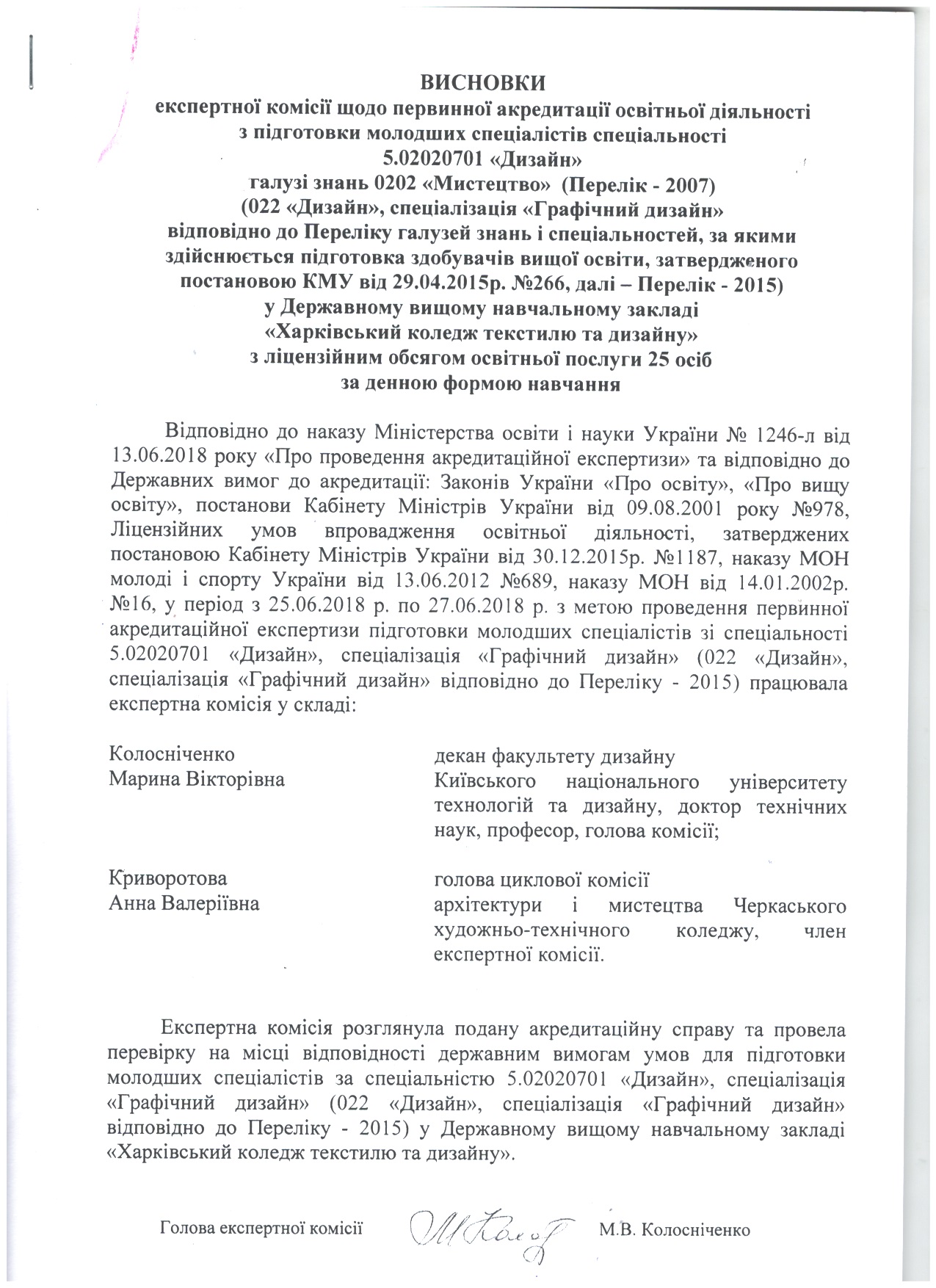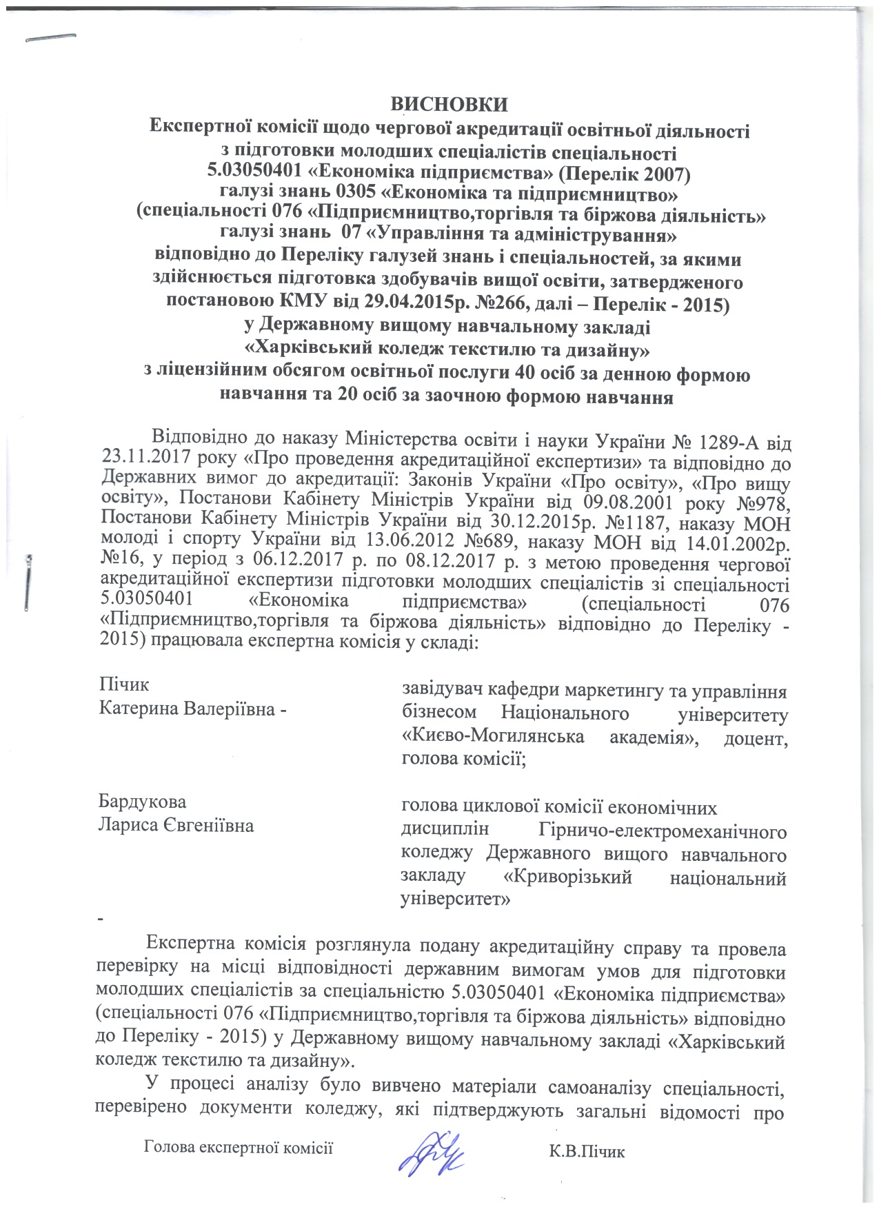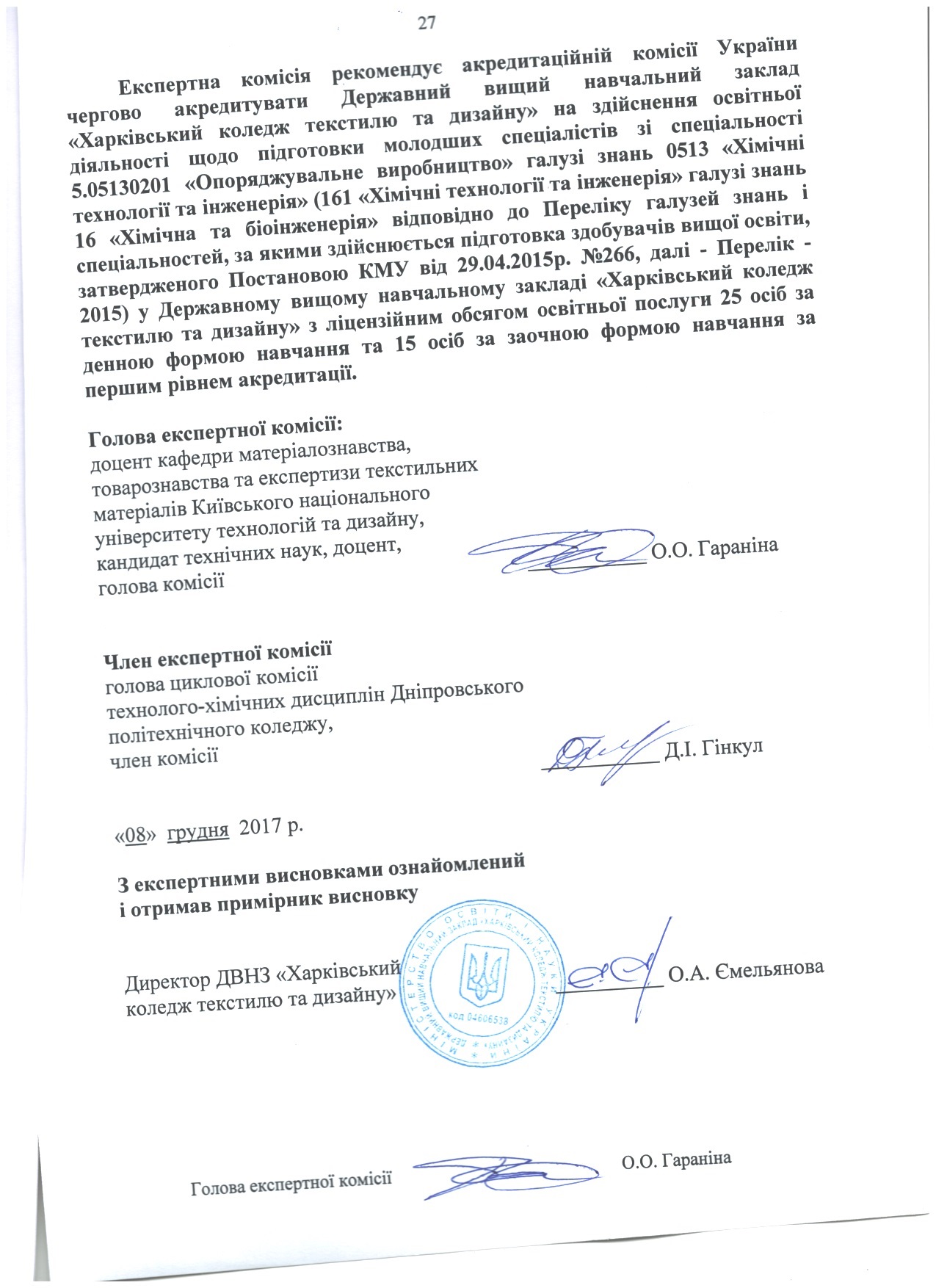 На підставі матеріалів, поданих на акредитацію Державним вищим навчальним закладом «Харківський коледж текстилю та дизайну» та перевірки діяльності коледжу на місці, експертні комісіїзробили такі висновки (див. гіперпосилання).
