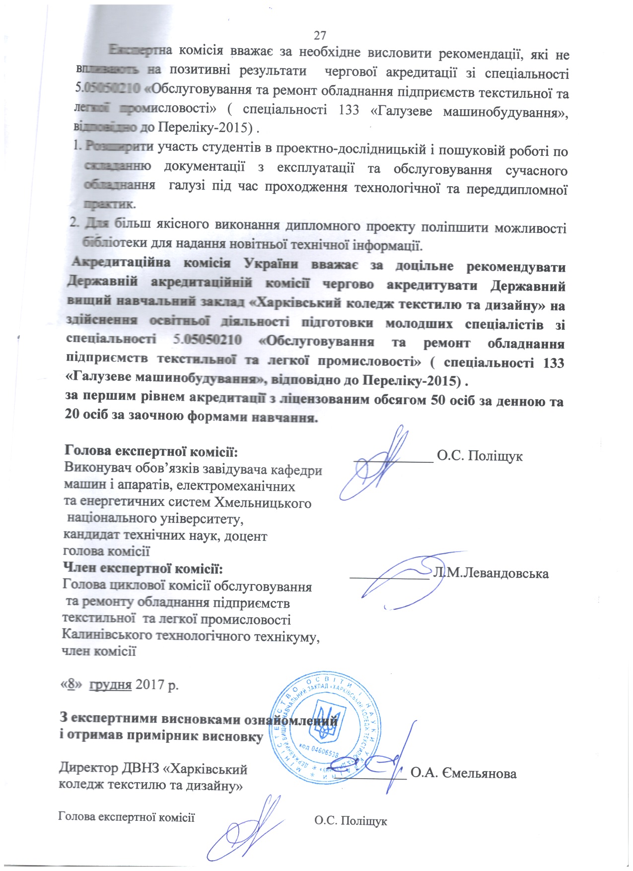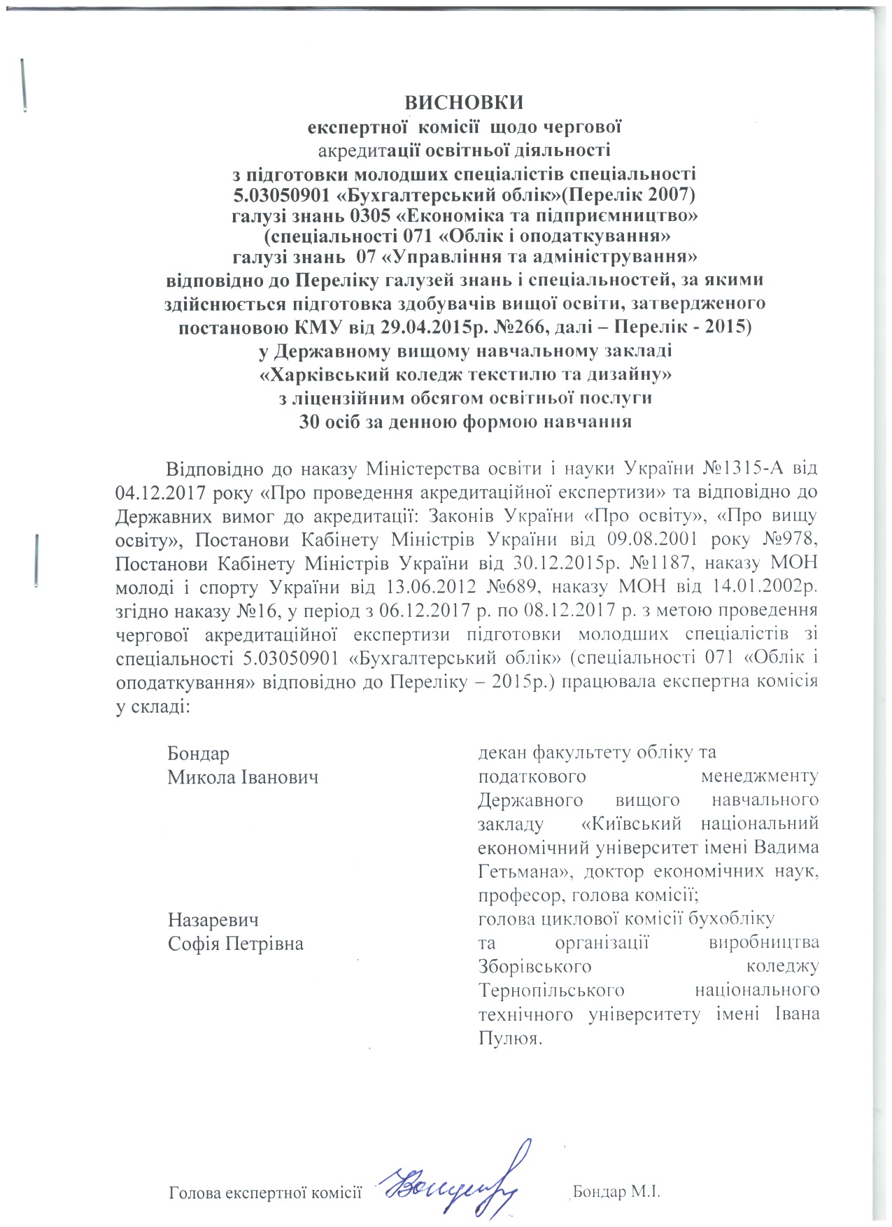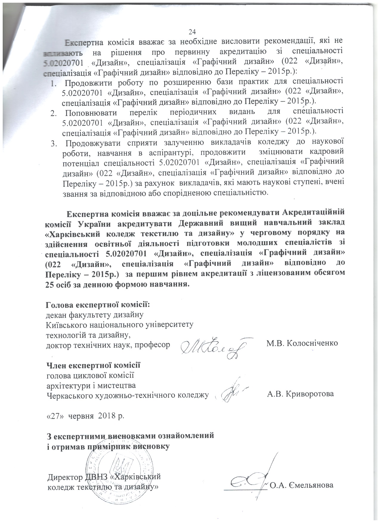 На підставі матеріалів, поданих на акредитацію Державним вищим навчальним закладом «Харківський коледж текстилю та дизайну» та перевірки діяльності коледжу на місці, експертні комісіїзробили такі висновки (див. гіперпосилання).