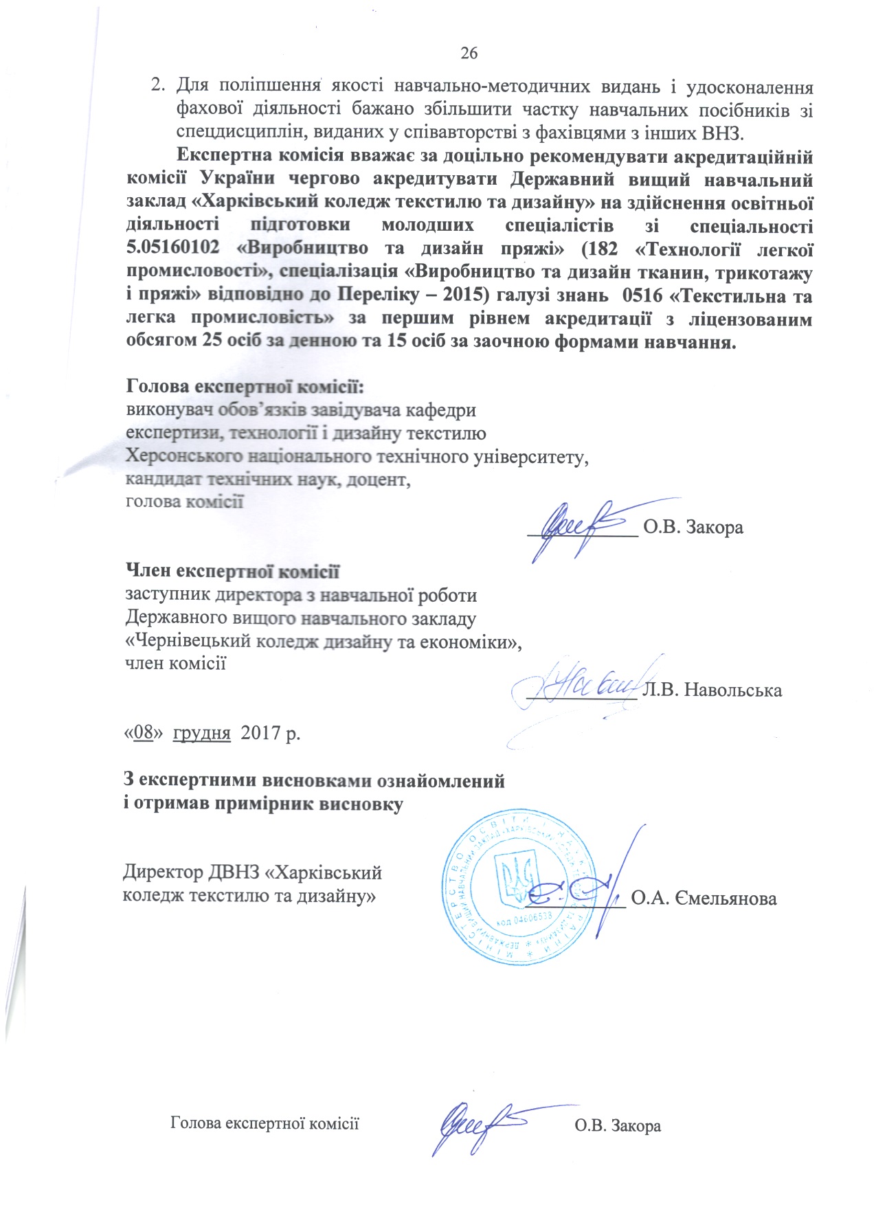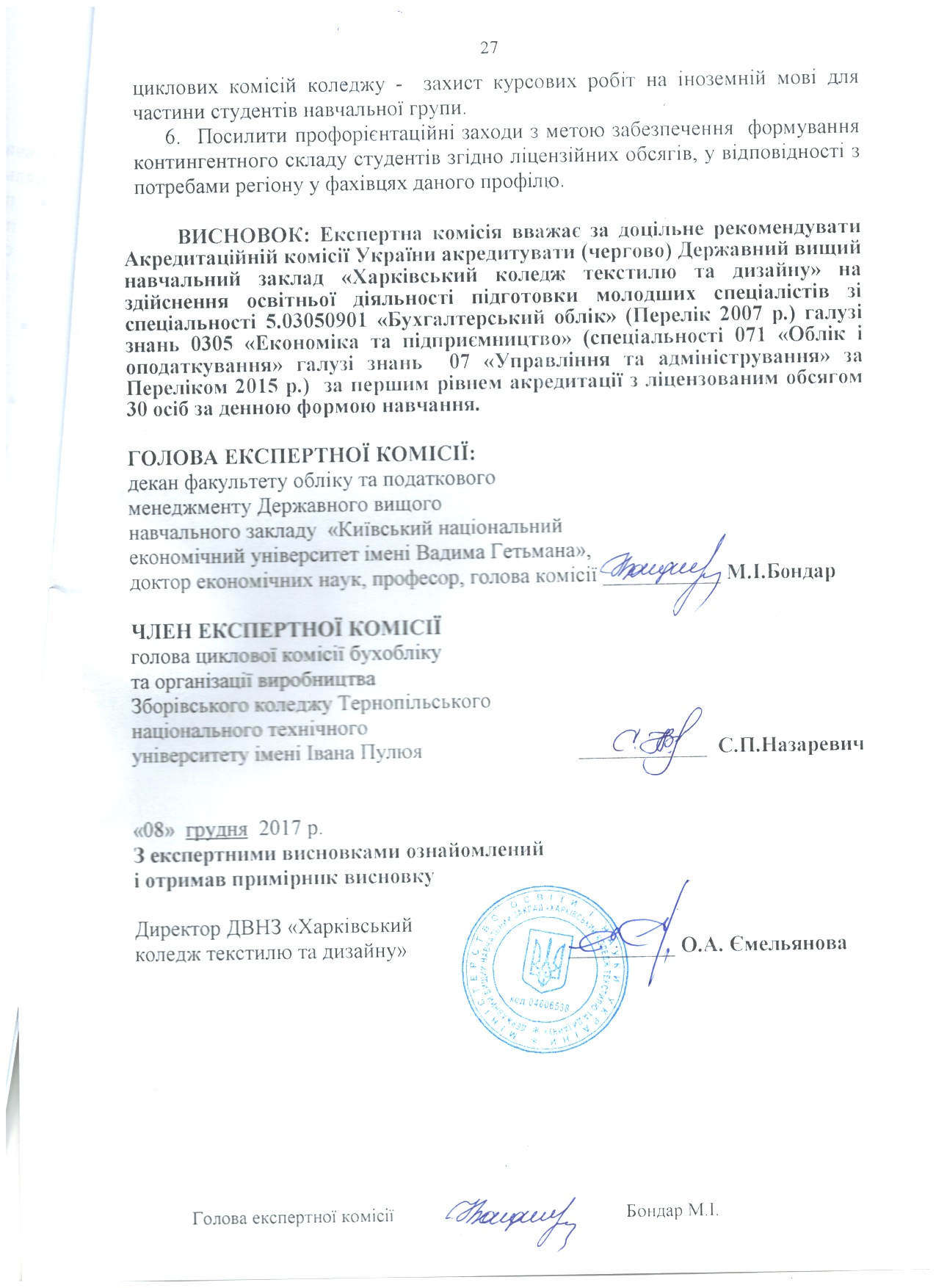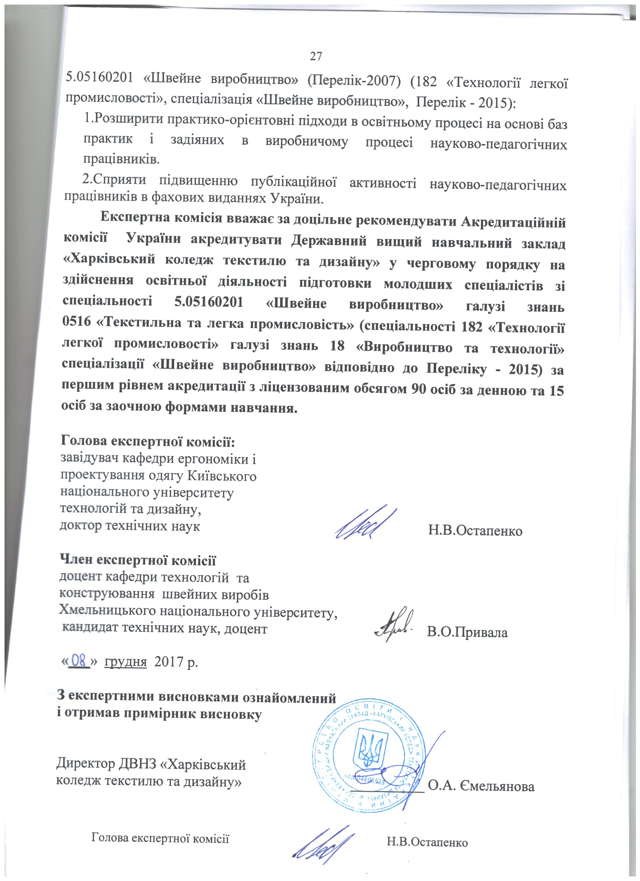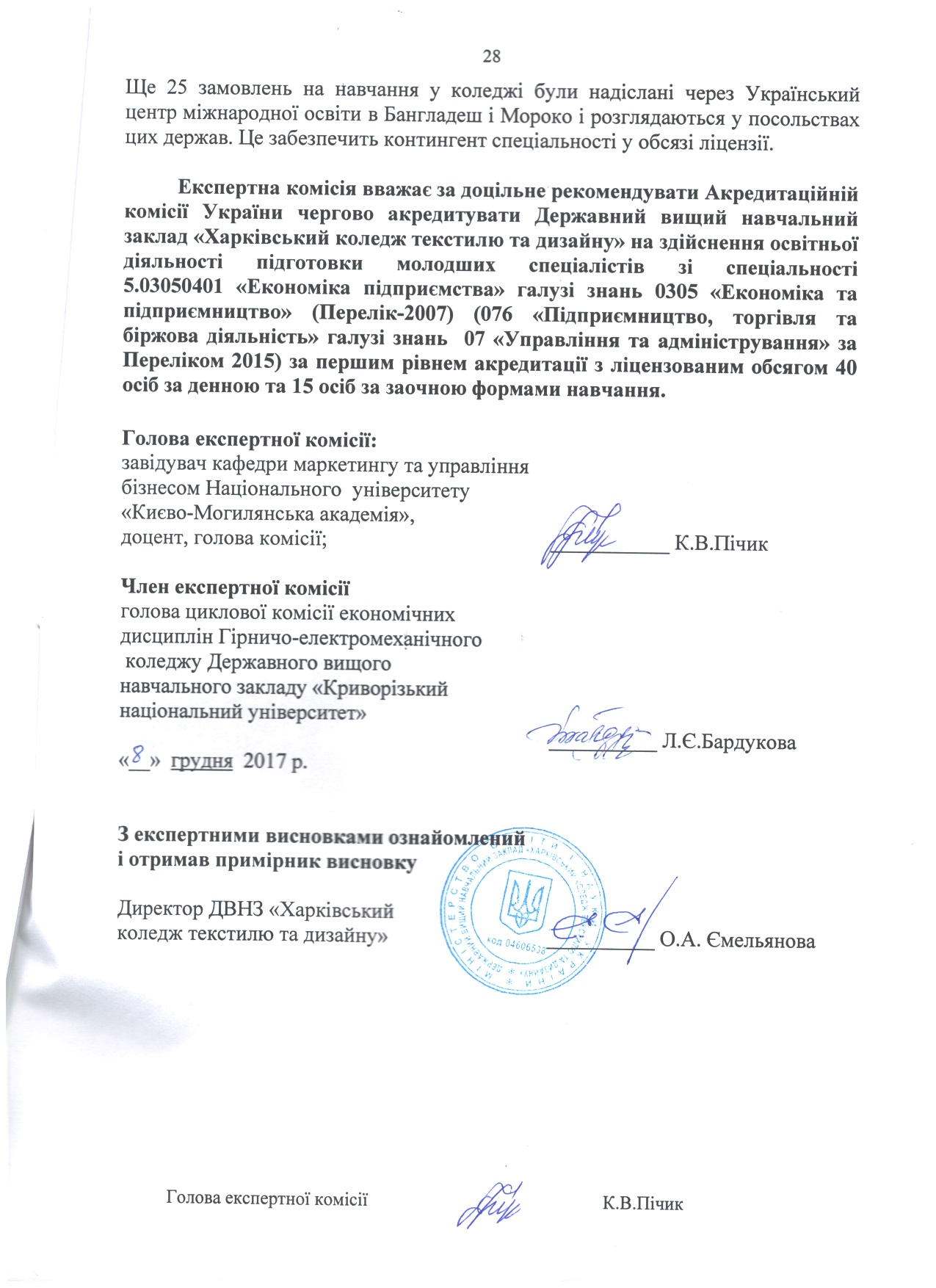 На підставі матеріалів, поданих на акредитацію Державним вищим навчальним закладом «Харківський коледж текстилю та дизайну» та перевірки діяльності коледжу на місці, експертні комісіїзробили такі висновки (див. гіперпосилання).