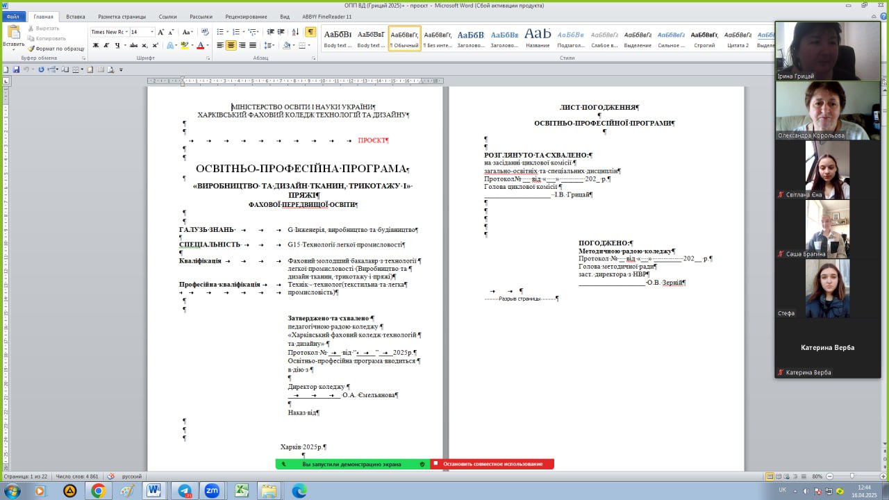 16 квітня відбулось засідання робочої групи проєкту освітньо-професійної програми «Виробництво та дизайн тканин, трикотажу і пряжі» зі здобувачами освіти з відповідної спеціальності та роботодавцями.